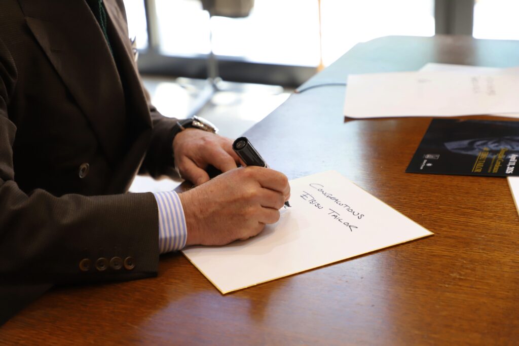 ポスターや色紙にサインをするダグラスさん。