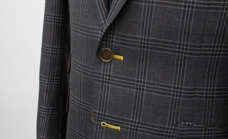 グレーのチェックにイエローのボタンホールカラーがピリっと良いアクセントになっています